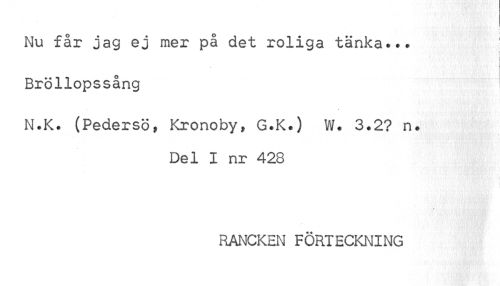 //// Nu får jag ej mer på det roliga tänka... ! //// i //// Bröllopssång //// N.K. (Pedersö, Kronoby» G.K.) W. 3.2? n. //// Del I nr 423 //// RANCKEN FÖRTECKNING ////