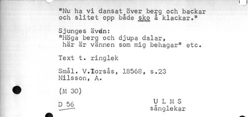//// "Nu ha vi dansatoöver berg och backar och slitet opp både sko å klackar." //// Sjunges ävdn: //// "Höga berg och djupa dalar, här är vännen som mig behagar" etc. //// Text t. ringlek //// Srnål. V.Torsås, 18568, s.23 Nilsson, A. //// D 56 V L M S //// „__-• sånglekar ////