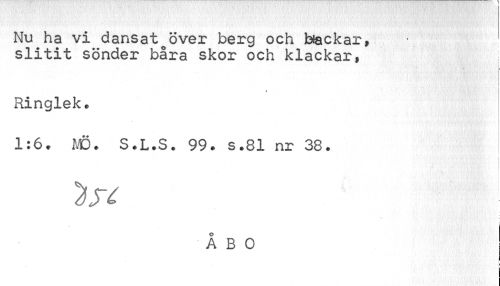 //// Nu ha vi dansatoöver berg och blackar, slitit sönder båra skor och klackar, //// - //// < //// Ringlek. //// 1:6. MÖ. S.L.S. 99. s.81 nr 38. //// tu //// ! //// ÅBO //// m m //// I ////
