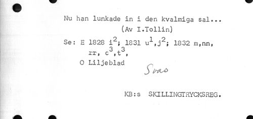 //// Nu han lunkade in i den kvalmiga sal».. //// (Av I.Tollin) //// Se: E 1828 i2; 1831 u^j2; 1332 m,nn, //// 3 .3 rr, c ,t , //// O Liljeblad //// S //// KB:s SKILLINGTRYCKSREG. ////