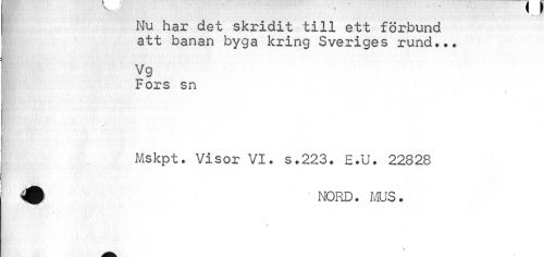 //// Nu har det skridit till ett förbund att banan byga kring Sveriges rund... //// Vg //// Fors sn //// % //// Mskpt. Visor VI. s.223. E.U. 22828 //// ' NORD. MUS. //// ¦ //// //// /
