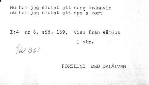 //// Nu har jag slutat att supa brännvin nu har jag slutat att spe'a kort //// 1:4 nr 6, sid. 169, Visa från Måmlius //// 1 str. //// FORSLUND MED DALÄLVEN ////