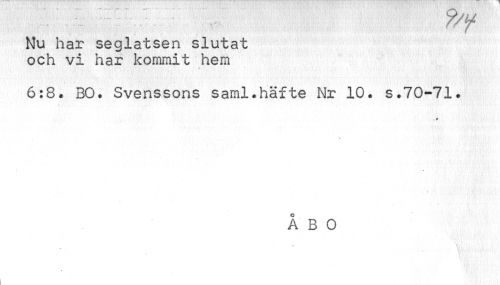 //// Nu har seglatsen slutat och vi har kommit hem //// 6:8. BO. Svenssons saml.häfte Nr 10. s.70-71. //// > //// ÅBO //// V //// I ////