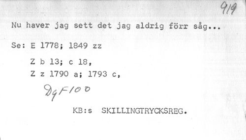 //// ¦ :;' T/f //// Nu haver jag sett det jag aldrig förr såg... //// I //// Se: E 1778; 1849 zz //// Z b 13; c 18f Z z 1790 a; 1793 c, //// KB:s SKILLINGTRYCKSREG. //// / \ ////