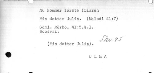//// Nu kommer förste friaren //// Min dotter Julia. (Melodi 41:7) //// Sdml* Mörkö, 41:5,s.l. Roosval. //// (Min dotter Julia)* w U L M A ////