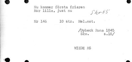 //// Nu kommer första friaren //// Mor lilla, just nu yjlpr-fi' //// t //// Nr 146 10 str. Mel.not. //// /Dybeck Runa 1845 Skv. s.18 //// /WIEDE MS ////