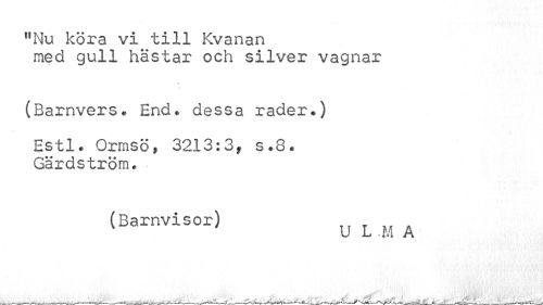 //// !lNu köra vi till Kvanan med gull hästar och silver vagnar //// \ t //// (Barnvers. End. dessa rader.) //// Estl. Ormsöf 3213:3f s.8. Gärdström. //// (BarnViSOr) UL.MA ////