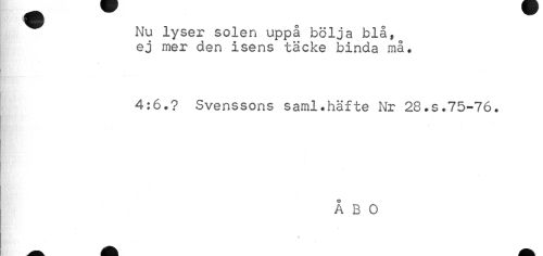 //// ^ Nu lyser solen uppå bölja blå, //// ej mer den isens täcke binda må. //// 4:6.? Svenssons saml.häfte Nr 28.s.75-76. //// ÅBO ////