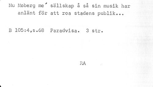 //// Nu Moberg me sällskap a sa sin musik har anlänt för att roa stadens publik... //// B 105:4*s.6S Paradvisa. 3 str. //// RA ////