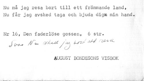 //// Nu må jag resa bort till ett främmande land, Nu får jag avsked taga och bjuda dig ku min hand. //// Nr 16, Den faderlöse gossen, 6 str. //// ft^ AT^ vA^a/a* LmJ ^ //// AUGUST BONDESONS VISBOK //// * • //// , ^ ___£ ////