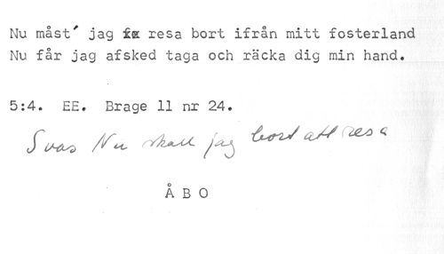 //// Nu måst' jag £ec resa bort ifrån mitt fosterland Nu får jag afsked taga och räcka dig min hand. //// 5:4. EE. Brage 11 nr 24. //// ÅBO ////