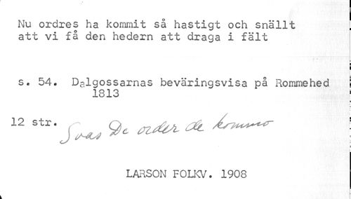 //// Nu ordres ha kommit så hastigt och snällt ! //// att vi få den hedern att draga i fält //// i I //// s. 54. Dalgossarnas beväringsvisa på Rommehed i //// 1813 1 //// u //// 12 Str' CiHUi ^ ^^ ^ ! //// I //// LARSON FOLKV. 1908 ////