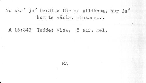 //// Nu ska' ja' berätta för er allihopa, hur ja' //// kom te värla, minsann... //// 0 //// 4 16:348 Teddes Visa. 5 str. mel. //// • v ¦?• //// RA ////