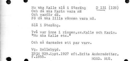 //// H \ - ^^ //// Nu ska Kalle slå i Storäng D 131 (128) Och då ska Karin vara mä ' % //// Och varför dä. //// Fö då ska lilla vännen vara mä. Slå i Storäng. //// Två var inne i ringen,ex.Kalle och Karin. 11 Nu ska Kalle etc." //// Och så dansades ett par varv. //// Vg. Bollebygd. //// IFGH 929.Uppt.1927 eft.Brita Andersdotter, A Ä f.1855. NORD. MUS. ä ////