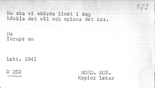 //// <7SJ //// Nu ska vi skörda linet i dag //// häckla det väl och spinna det bra. | //// Ha //// Torups sn j //// « //// Lekt. 1941 - I //// D 252 NORD. MUS. j //// * Kopior Lekar I //// i //// \ ////