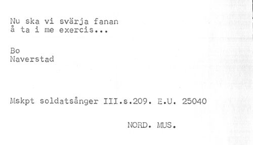 //// Nu ska vi svärja fanan , //// å ta i rne exercis... //// Bo //// Naverstad //// Mskpt soldatsånger III.s.209. E.U. 25040 //// NORD. MUS. ////