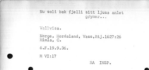 //// » ¦ * //// Nu soli bak fjelli sitt ljusa anlet //// g0ymer..t //// ¦ //// ¦ //// Vallvisa. //// Norge, Hordaland, Vass»Rtj.1627:26 Himla, C. //// 6.F.19.9.36. //// ^EvÄj Ml JV. tJ //// •M VI:17 //// ____ _ //// RA INSP. ////