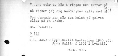 //// "...nu står du här i ringen och tittar på //// mig, //// sa räcker jag dig handen,kom valsa med mig" //// Den dansade man när som helst på golvet eller på en backe. //// Bo. Lysekil. D 123 //// Ä IFGH 4460-9 Uppt.Bertil Westergren 1940 eft. //// ^P Anna Wallin f.1859 i Lysekil. //// MORD. MUS. ////