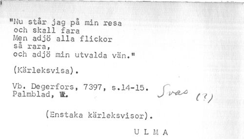 //// I - //// tlNu står jag på min resa och skall fara Men adjö alla flickor så rara, //// och adjö min utvalda vän." (Kärleksvisa)• //// « //// Vb. Degerfors, 7397, s.14-15. //// Palmblad, tt. , J ^ (1} //// (Enstaka kärleksvisor). //// U L M A ////