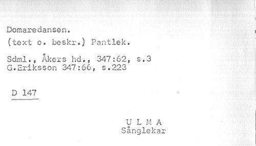 //// i //// Domaredansen, : //// ! //// C //// I //// (text o. beskr*) Pantlek, //// ! //// Sdml., Åkers hd., 347:62, s.3 G.Eriksson 347:66, s.223 //// D 147 //// i i i ¦ i i ' ' //// - //// U L M A Sånglekar ////