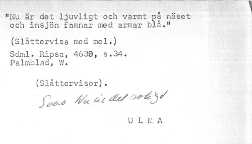 //// "Nu är det ljuvligt och varmt på näset och insjön famnar med armar blå." //// (Slåttervisa med mel.) //// Sdml. Ripsa, 4638, s.34. Palmblad, W. //// (Slåttervisor). //// U L M A ////