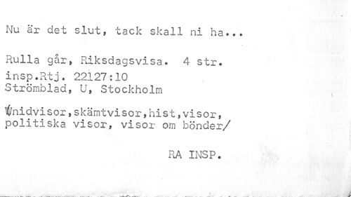 //// ' i'.1 *. I; ^ //// Nu ar det slut, tack skall ni ha... //// Rulla går, Riksdagsvisa. 4 str. insp.Rtj. 22127:10 //// Strömblad, U, Stockholm , //// ifrnidvisor,skämtvisor,hist,visor, //// politiska visor, visor om bönder //// /RA INSP. //// . - . .... ... -----'-v*>-I***"- --r-- ////