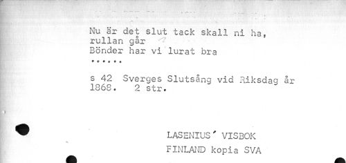 //// i - - - < -* i //// Nu är det slut tack skall ni ha, //// jT» ® //// rullan gar //// Bönder har vi lurat bra • . • * ? • //// s 42 Sverges Slutsång vid Riksdag år 1868. 2 str. //// UV*.-»,; • . .v\ //// ¦ //// Q //// 9 LASENIUS' VISBOK //// FINLAND kopia SVA ////