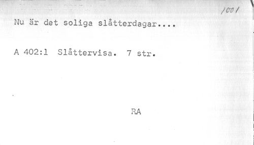 //// Nu är det soliga slåtterdagar.... //// I //// V //// A 402:1 Slåttervisa. 7 str. //// i i //// i //// RA //// k //// 9 ////