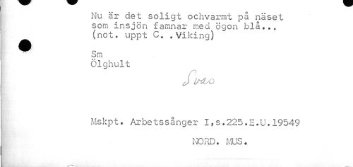 //// Nu är det soligt ochvarmt på näset som insjön famnar med ögon blå... (not. uppt C# .Viking) //// Sm //// Ölghult //// j lhvo //// ¦ //// Mskpt. Arbetssånger I»s.225.E.bM9549 //// NORD. MUS. ////