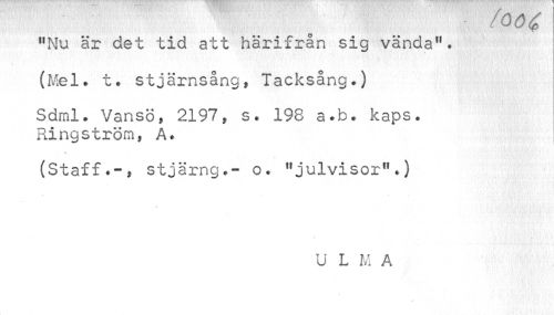 //// ¦ !0ö$ //// "Nu är det tid att härifrån sig vända". //// (Mel. t. stjärnsång, Tacksång.) //// Sdml. Vansö, 2197, s. 198 a.b. kaps. Ringström, A. //// (Staff.-, stjärng.- o. "julvisor".) //// V- //// U L M A //// i ;.ft . '-'i •' ////