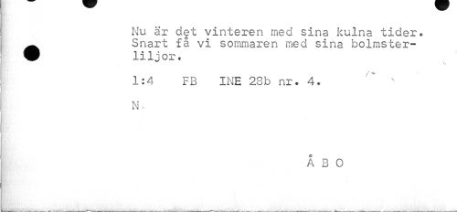 //// Nu är det vinteren med sina kulna tider. Ä Snart få vi sommaren med sina bolmster- //// fP liljor. //// 1:4 FB INE 28b nr. 4. s- //// N- //// ÅBO ////
