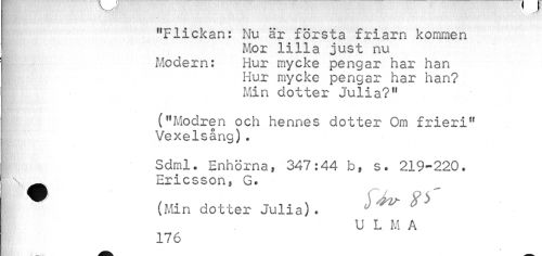 //// - v //// "Flickan: Nu är första friarn kommen //// Mor lilla just nu Modern: Hur mycke pengar har han //// Hur mycke pengar har han? Min dotter Julia?" //// ("Modren och hennes dotter Om frieri" Vexelsång). //// Sdml. Enhörna, 347:44 b, s. 219-220. \ ^ Ericsson, G* //// (Min dotter Julia). 4 ^ //// U L M A //// 176 ////