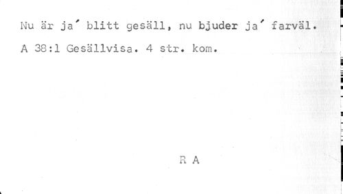 //// Nu är ja' blitt gesäll, nu bjuder ja' farväl. A 38:1 Gesällvisa. 4 str* kom. //// g //// i //// i ¦ //// r //// i ¦ //// R A ////
