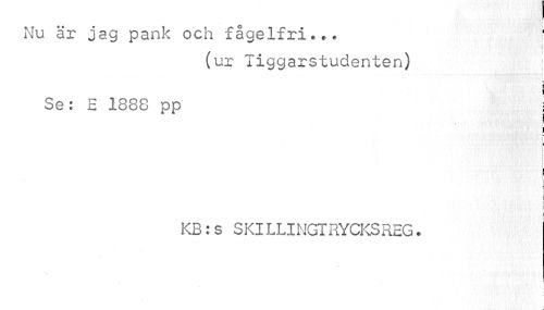 //// 1 //// Nu är jag pank och fågelfri... I //// : //// (ur Tiggarstudenten) //// v //// 2 //// Se: E 1888 pp i //// I //// i //// c i //// KB:s SKILLINGTRYCKSREG. ////