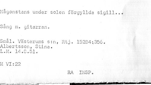 //// någonstans under solen förgyllda sigill... Sång m. gitarran. //// O //// >mal. Västerums s:n, Rtj. 15284^356. \lbertsson* Stina• L.M. 14.3.51. //// A VI:22 //// RA INSP. ////