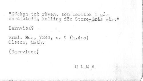 //// "Näcken tok räven, som borttok i går enaståtelig kelling för Store-Gråa vår." //// -K. , «... //// Barnvisa? • //// Vrml. Eda, 7343, s. 9 (h.4:o) Olsson» Math. //// (Barnvisor) //// ULMA //// //// /... ___ , v ...... _____- i jfat . ,t . . ..... . i -Aj. ... - . : J ////