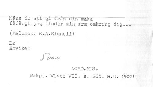 //// Näns du att gå från din maka //// fåfängt jag lindar min arm omkring dig... //// (Mel.not. K.A.Rignell) //// Dr //// Enviken //// J //// NORD.MUS. //// Mskpt. Visor VII. s. 265. E.U. 28891 //// \ ////