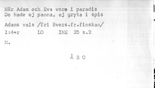 //// När Adam och. Eva vore i paradis | //// De hade ej panna, ej gryta i spis j //// Adams vals /fri övers*fr.finskan/ 1:4+r LO INE 35 s.2 //// N« //// * //// i //// | //// ÅBO I //// i //// i ¦ //// i g //// i ////
