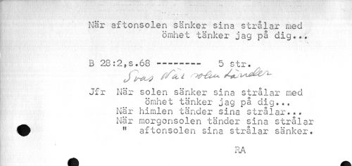 //// - - . //// När aftonsolen sänker sina strålar med //// ömhet tänker jag på dig... //// B 23:2,s.68 --- 5 str. //// Jfr När solen sänker sina strålar med //// ömhet tänker jag på dig... När himlen tänder sina strålar.** När morgonsolen tänder sina strålar ^^ H aftonsolen sina strålar sänker* //// RA ////