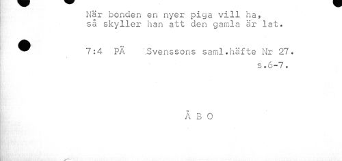 //// När bonclen en nyer piga vill ha, //// så skyller han att den gamla är lat* ' ** //// w 7:4 PA Svenssons saml.häfte Nr 27. //// s.6-7. //// ÅBO ////