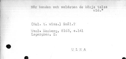 //// När bonden och soldaten de börja talas //// vid." //// i f' //// (Mel* t* visa.) Srnål*? //// Vsmlt Norberg, 8163, s.141 Lagergren, E. //// U L M A ////