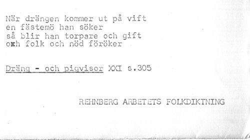 //// När drängen kommer ut på vift //// en fästemö han söker //// så blir han torpare och gift oEh folk och nöd föröker //// Dräng - och pigyisor XXI s * 305 //// REHNBERG ARBETETS FOLKDIKTNING //// « //// _____ ^^____^^ , ^ ...... ...fJ ////