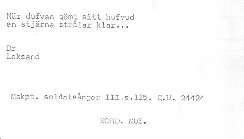 //// När dufvan gömt sitt hufvud en stjärna strålar klar... //// Dr //// Leksand //// Mskpt. soldatsånger III.s.115. E.U. 24424 //// NORD. MUS. ////