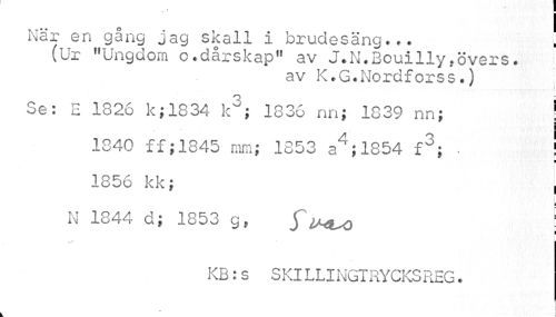 //// När en gång jag skall i brudesäng... //// (Ur "Ungdom o.dårskap" av J.N.Bouilly»övers. //// av K.G.Nordforss.) //// i //// Se: E 1826 k;1834 k3; 1336 nn; 1839 nn; j //// § //// 1840 ff;1845 mm; 1353 a4;1854 f3; . | //// ¦ //// 1856 kk; , //// i //// N 1844 d; 1853 g, $V^o \ //// . / • //// KB:s SKlLLINGTRYCKSREG. //// I ////