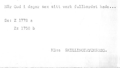 //// När Gud i dagar sex sitt verk fullbordat hade... //// Se: Z 1778 a Zz 1758 b //// KB:s SKILLINGTRYCKS REG. ////