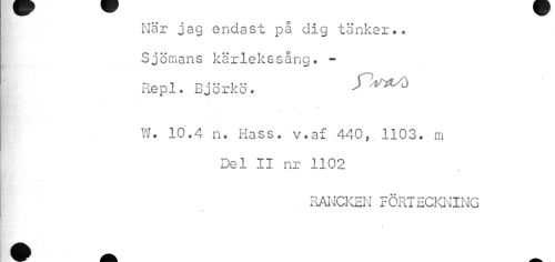 //// När jag endast på dig tänker.. Sjömans kärlekssång. -Repl. Björkö. //// W. 10.4 n. Hass. v.af 440f 1103. m //// Del II nr 1102 //// RANCKEN FÖRTECKNING //// r ////