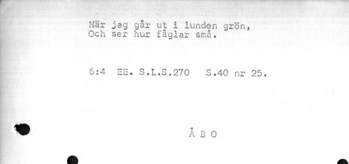 //// När jag går ut i lunden grön, //// Och ser hur fåglar små. //// 6:4 EE. S.L.S.270 S.40 nr 25. //// I',. A ////