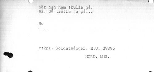 //// M«KIfc?&f--< • . . > - . ...... ^ //// . //// När jag hem skulle gå, si, då träffa ja på.,* //// Bo //// . //// « • //// * //// v //// • • //// Mskpt. Soldatsånger. E.U. 29895 ^^ NORD. MUS. ////