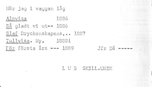 //// När jag i vaggan låg //// Alpvisa 1836 //// Så. gladt vi ut-- 1886 SIaf Dryckenskapenst .. 1887 Tullvisa * Ny, 1388i //// För första års --- 1889 Jfr Då ----- //// L U B SKILL.UNIK //// i ////