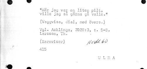 //// "När jag var en liten pilt, ville jag så gärna gå valle." //// (Vaggvisa, dial, med övers.) //// Vgl. Acklinga, 3528:3, s. 5-8. Larsson, Th. //// (Barnvisor 415 //// U L M A //// t //// B ////